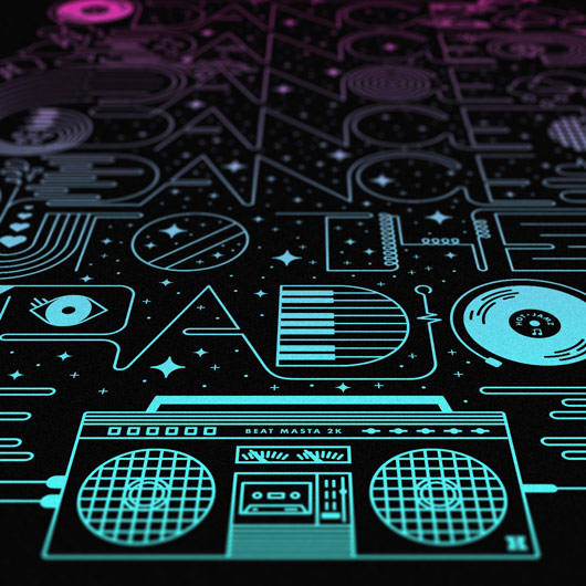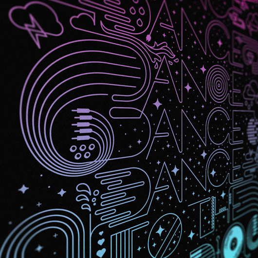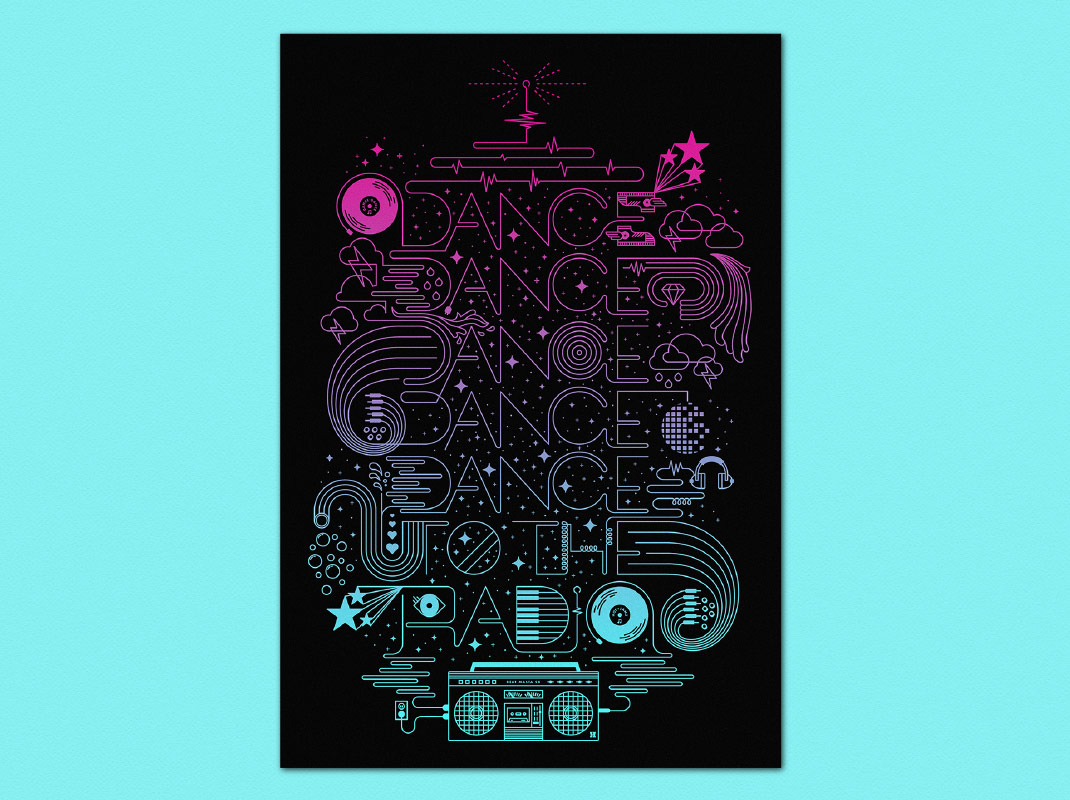 Sometimes we find a few hours in the day to do something just for fun. We use this time to hone our lettering and illustration skills and to experiment without constraints. It’s a time to stretch and play. Here we illustrated the chorus from Joy Division’s seminal song Transmission, weaving together playful icons of dance and music. This poster was screenprinted as a pink and blue split screen on matte black paper.