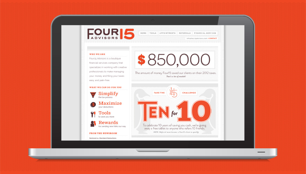 Founded by Eric Feldman in 2003, Four15 Advisors is a boutique financial services company that specializes in working with creative professionals to make managing your money and filing your taxes easy and pain-free.