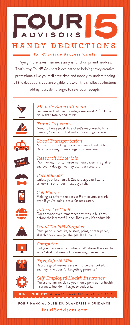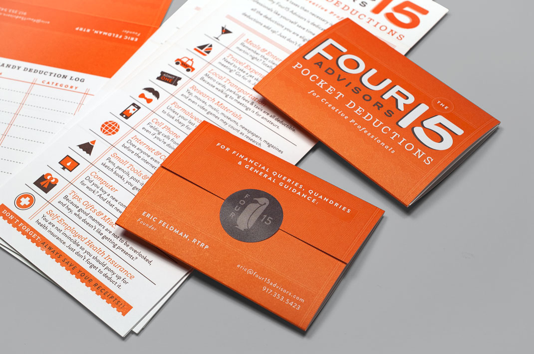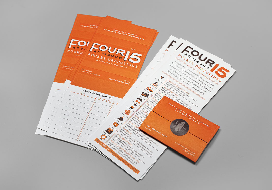 We developed a printed piece that features a series of categories and items to educate creatives on the deductions available to them. The brochure folds to the size of a business card so it can be easily tucked inside a wallet or purse. The only thing you need to remember is to save your receipts!