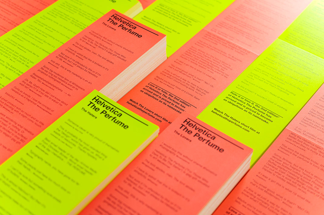 A companion print piece was created to feature a series of quotes from the lovers and haters of Helvetica The Perfume gathered from across the internet. The quotes are also featured on the website.
