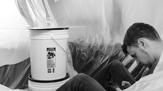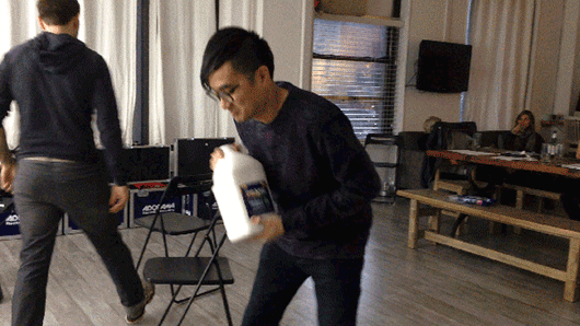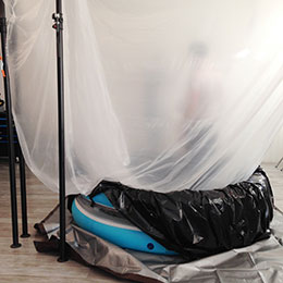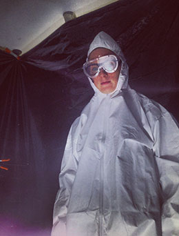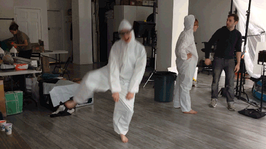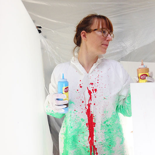 Two elaborate sets were built to house the giant mess we created while shooting. Both involved kiddy pools and lots and lots of plastic sheeting.