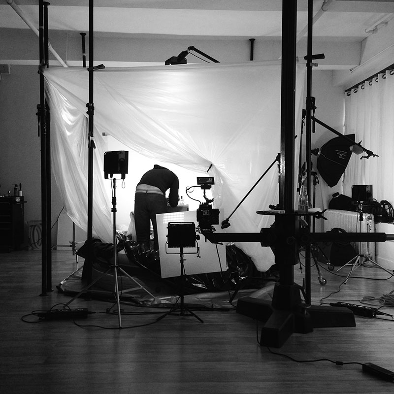 We had to create a rigging system that held the bottle still during shooting but would also be flexible enough to allow us to remove the bottle and clean it off between shots.