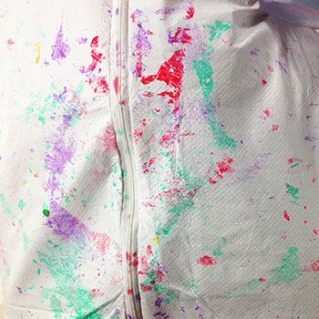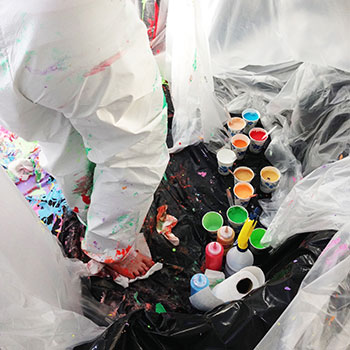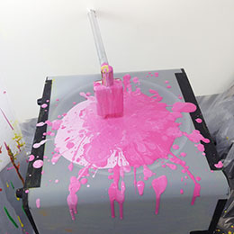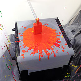 We used the soundwaves from a sub woofer to create all of the bouncing paint shots. It took a lot of experimentation to find the right song to create enough energy to force the paint up off the surface of the sub. Eventually we settled on Blurring Lines by Blackbird Blackbird.