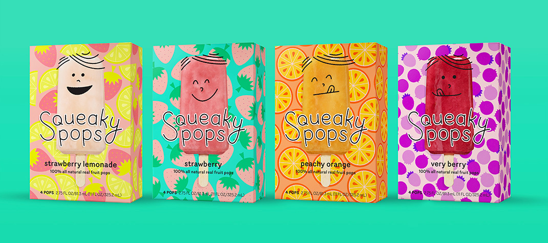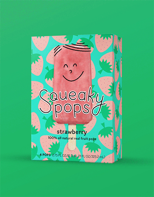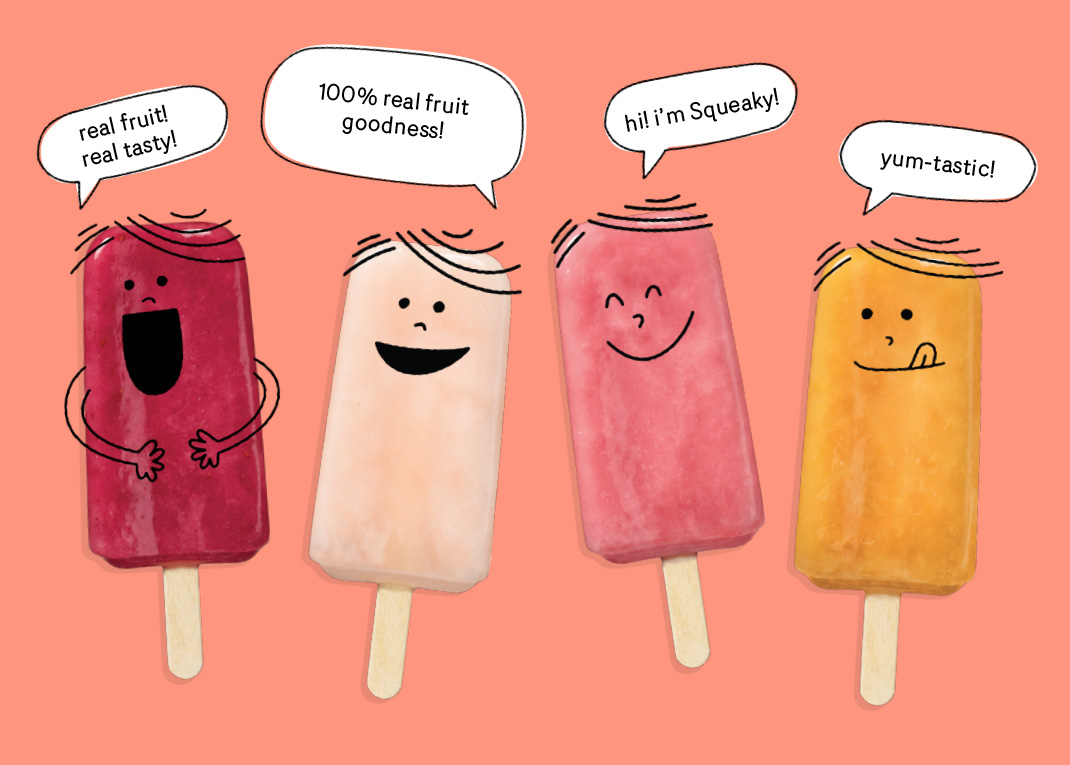Entrepreneur Taylor Llewellyn could not imagine feeding his new son, Baker, the artificial, sugary popsicles that dominate grocery store shelves, so he decided to create a healthier ice pop, with Baker (aka Squeaky) as his chief taste-tester. Embodying imagination, creativity, and the nostalgia of hot summer days, we developed the character of Squeaky to champion the brand and appeal to parents and kids alike.
