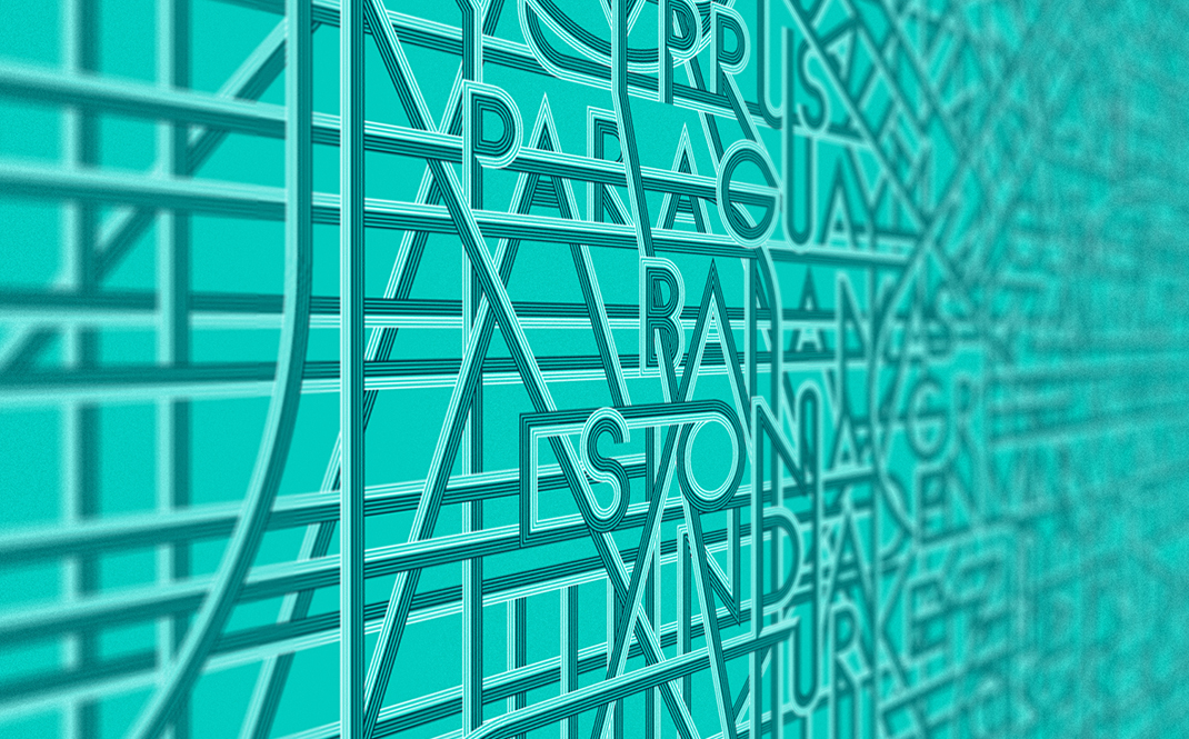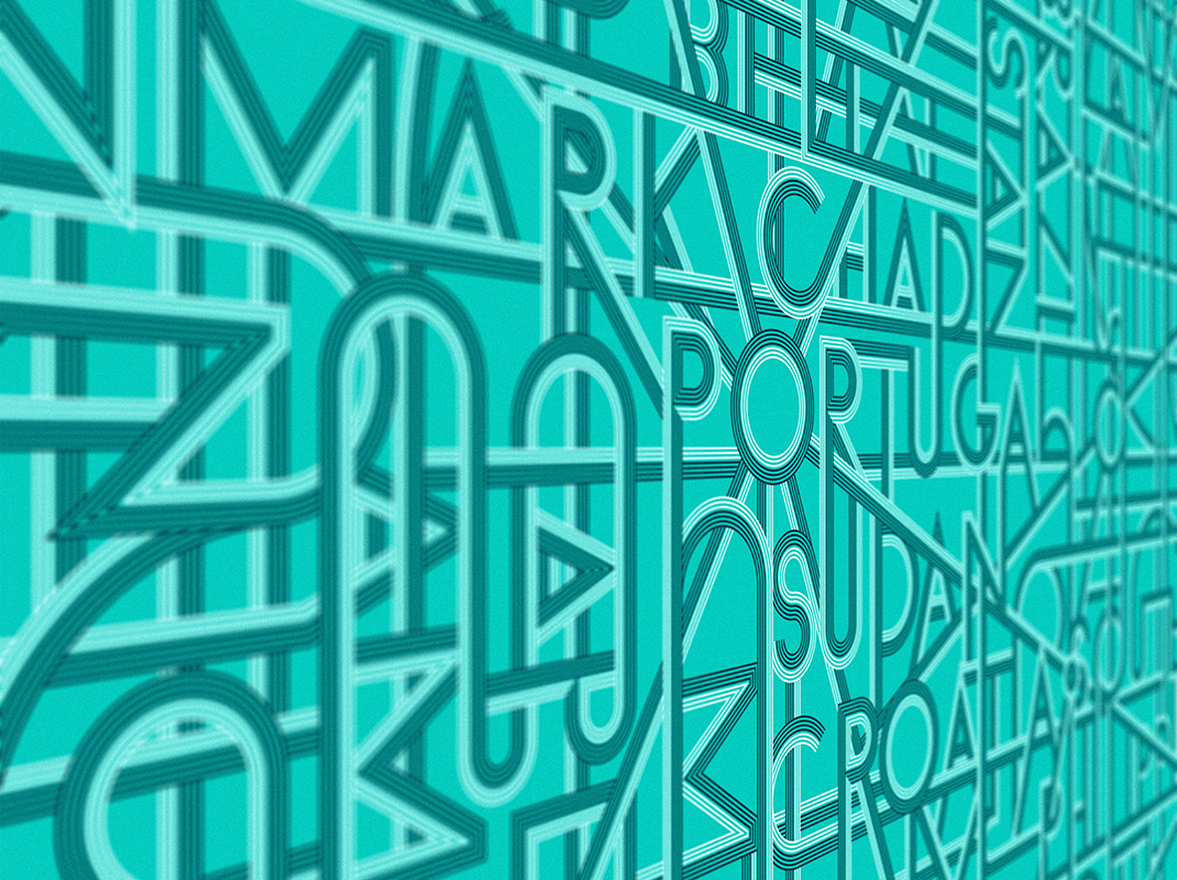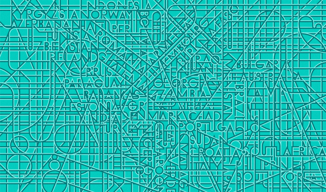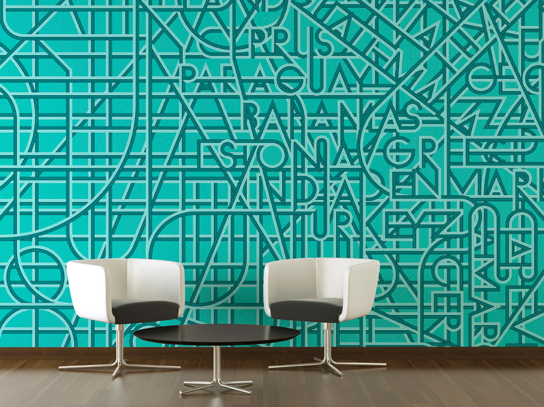 Starwood Hotels commissioned Guts & Glory to create a large mural for the lobby of their new Washington DC hotel. The mural needed to contain all of the names of the countries along Embassy Row. We spent weeks neurotically weaving sixty plus countries together with an abstracted map of Washington DC. Meticulously knitting typography with cartography is right up our detail-obsessed alley!