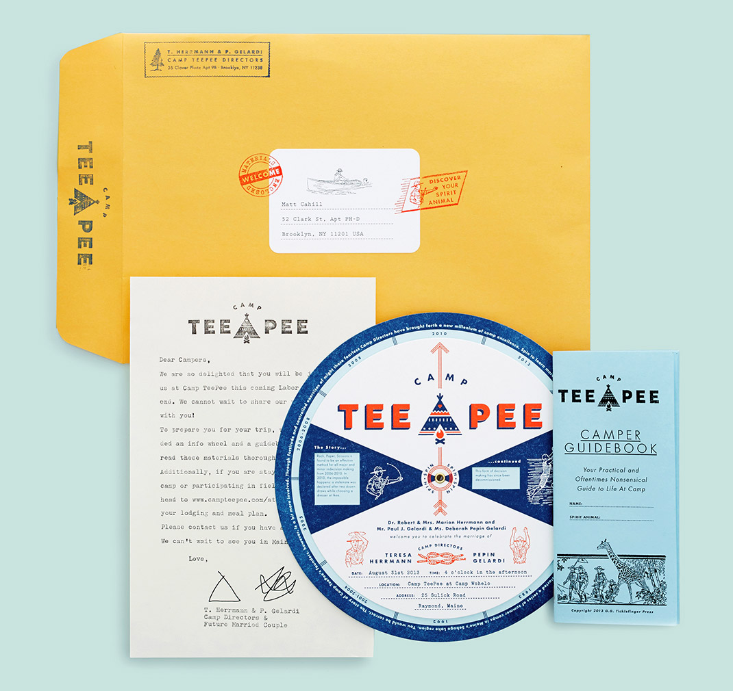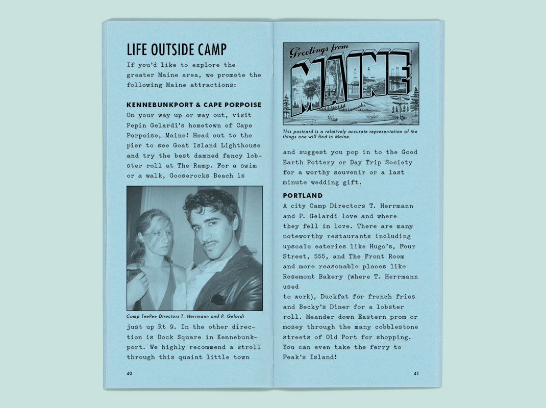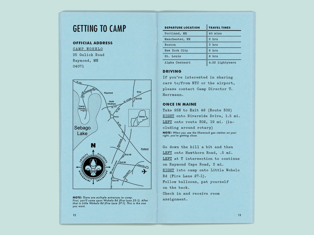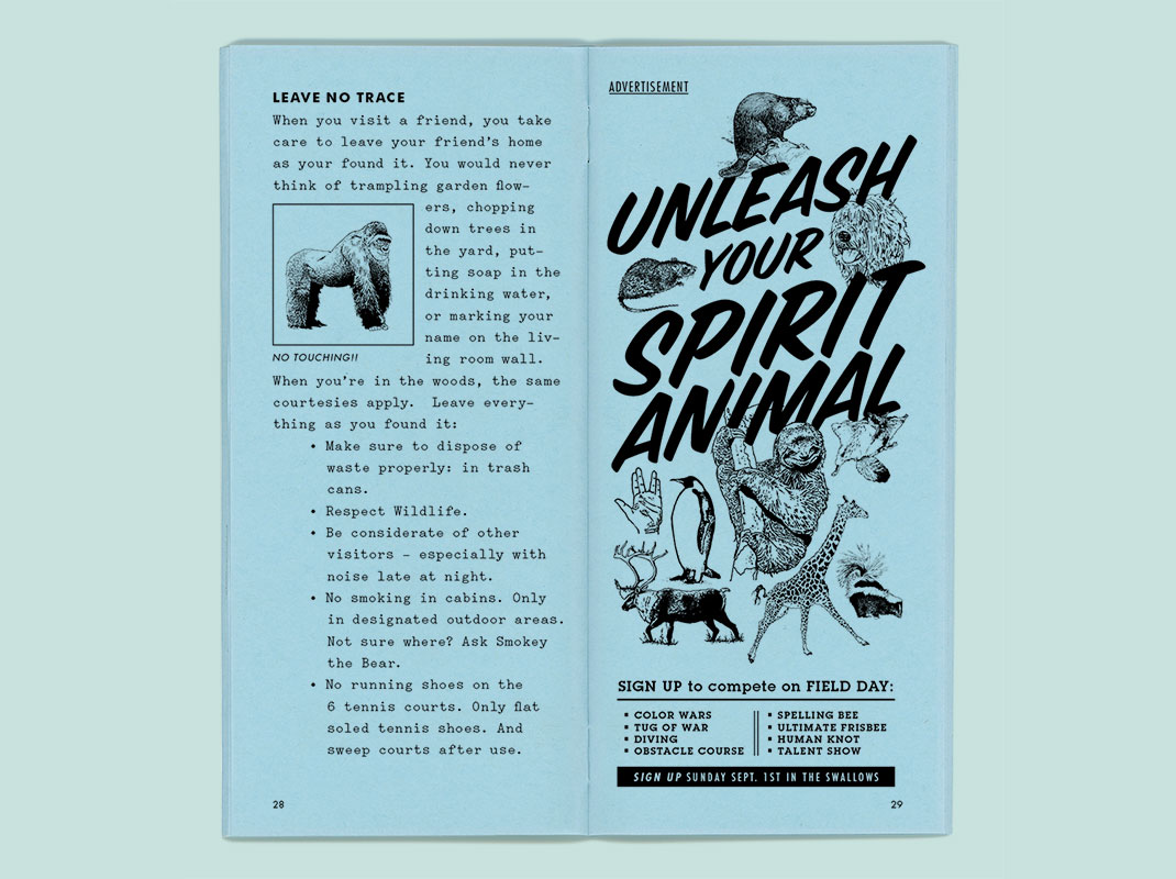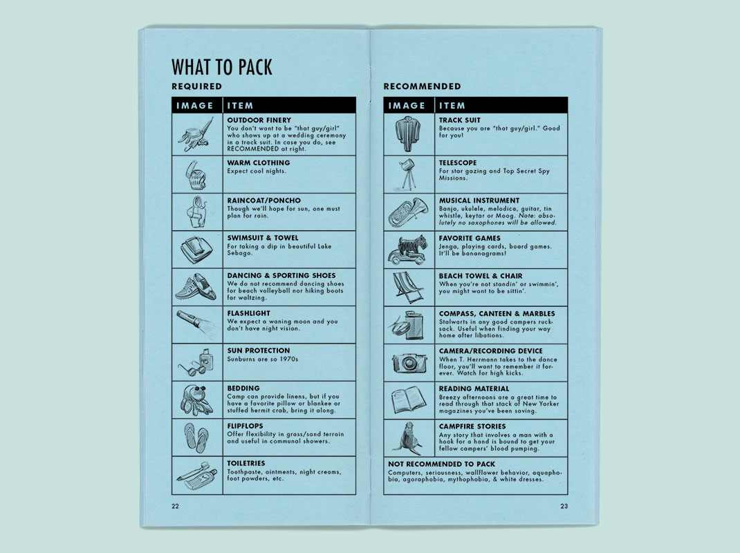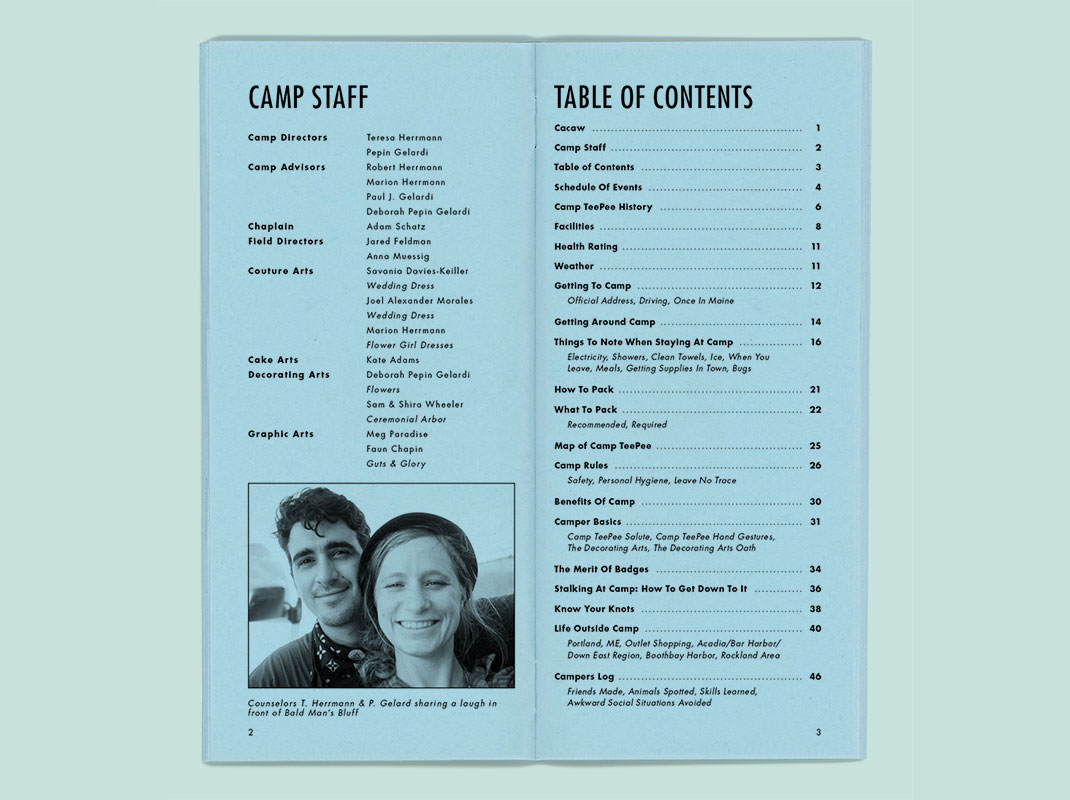 For the wedding of our friends Teresa & Pepin, we worked together to create the identity and collateral for their camp themed wedding. The system including a letterpressed info wheel, stationery set and a 50 page camp guidebook. We worked closely with the couple to craft both the content and the writing, merging the pragmatics of camp advice and boyscout vigor with absurdist humor. Somehow, a giraffe got involved.
