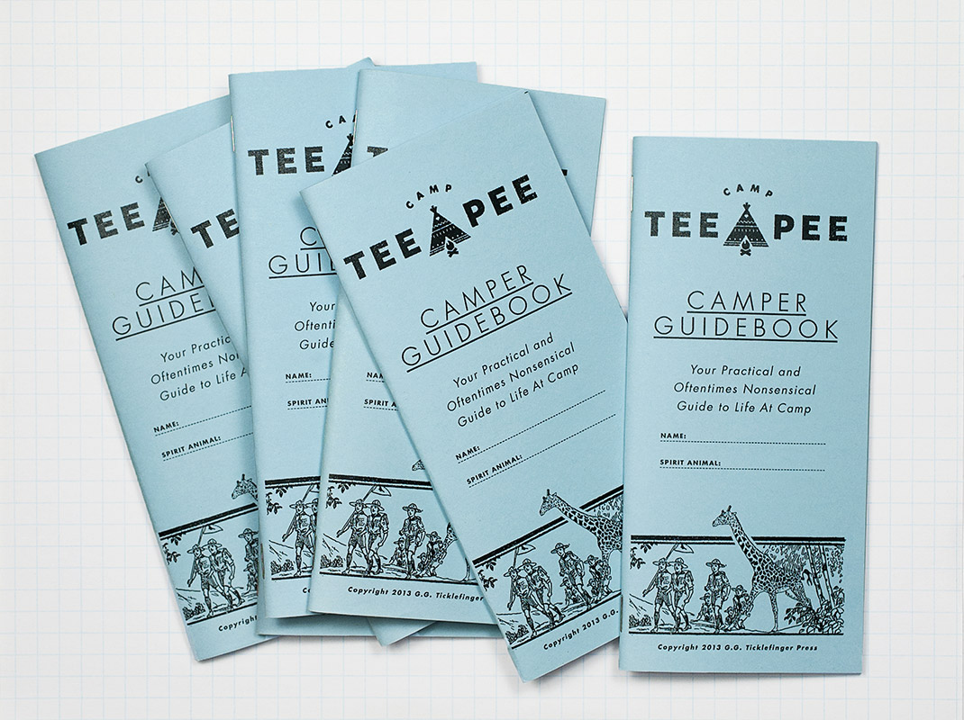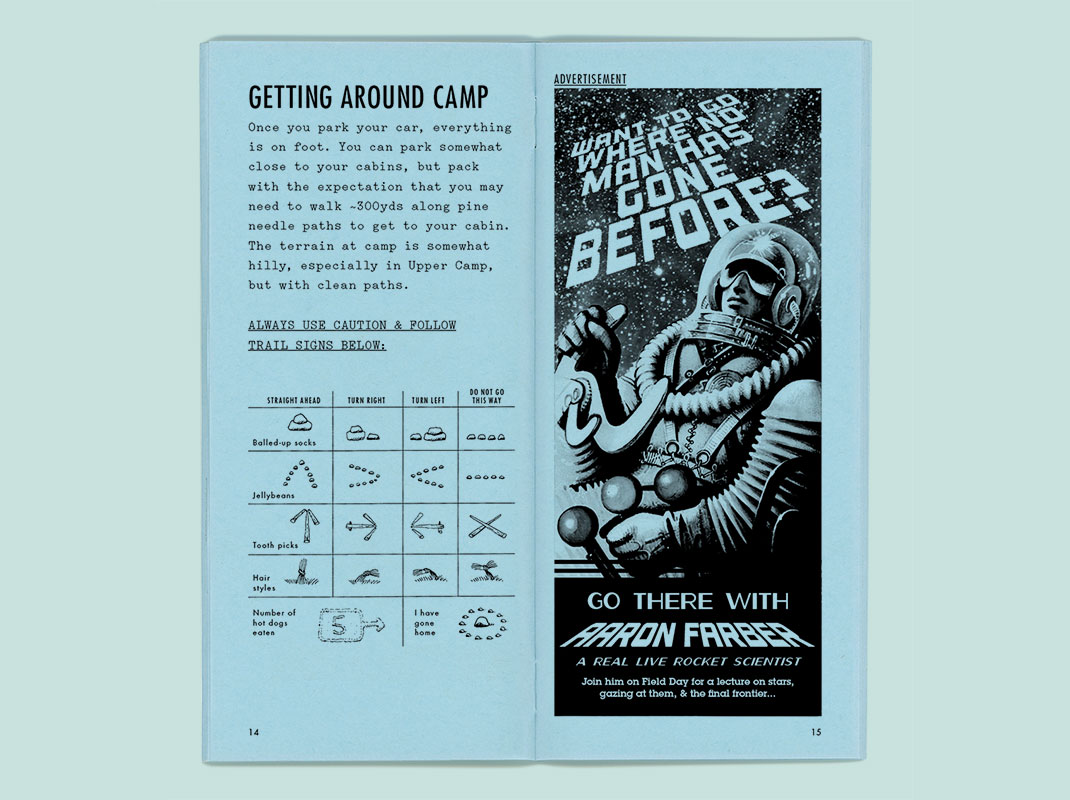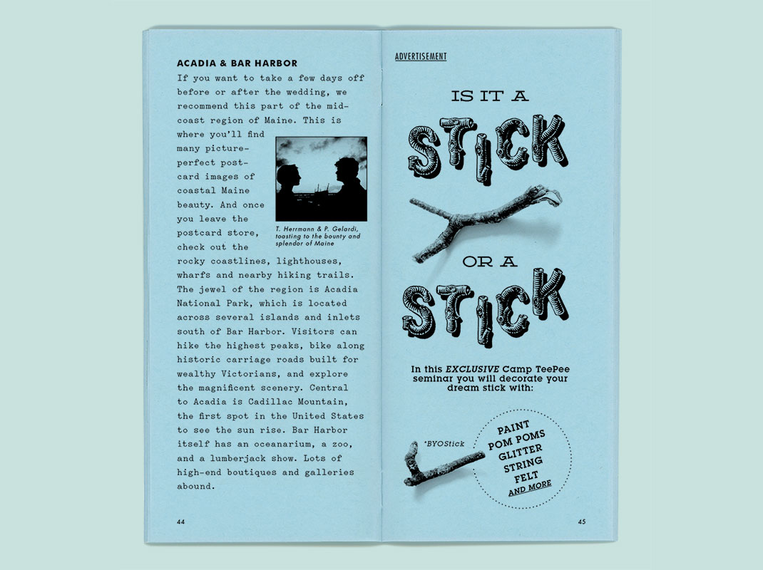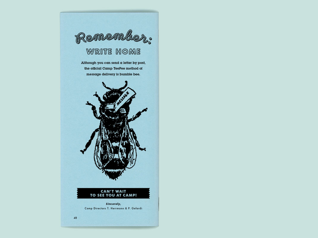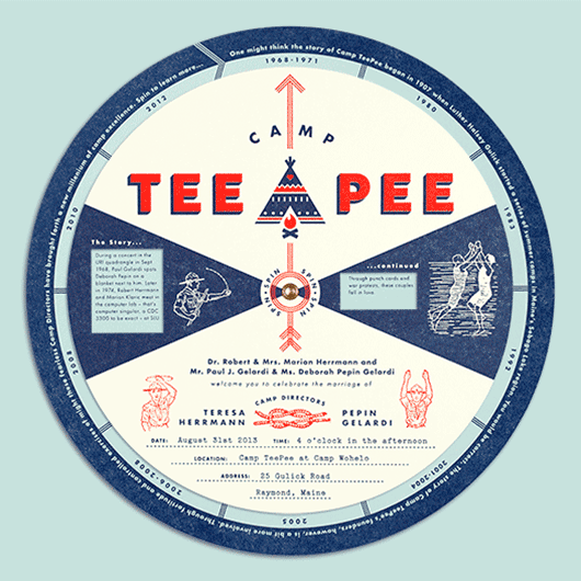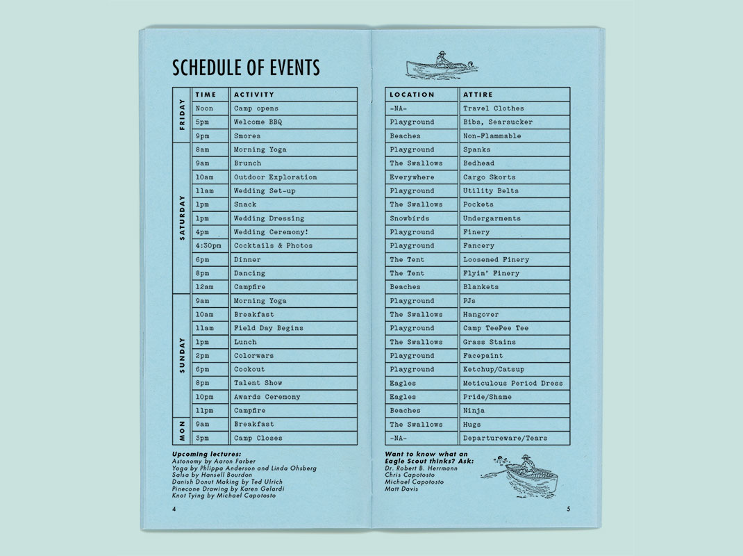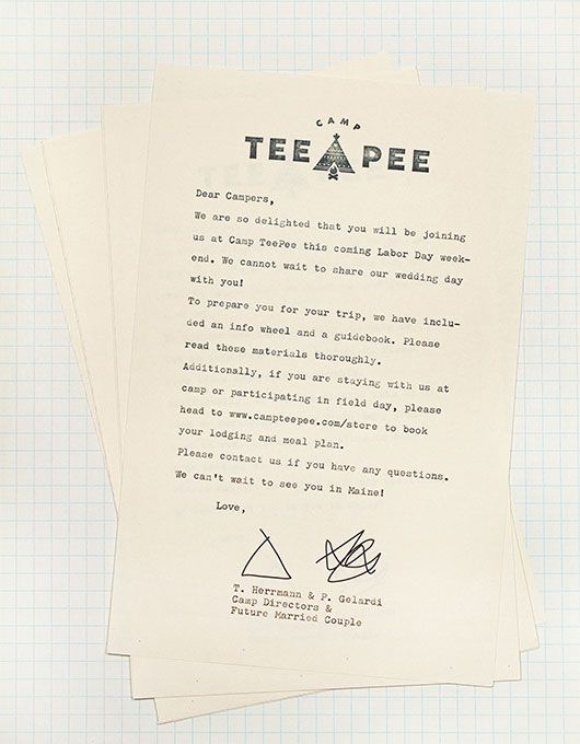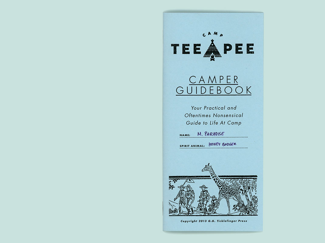 For the wedding of our friends Teresa & Pepin, we worked together to create the identity and collateral for their camp themed wedding. The system including a letterpressed info wheel, stationery set and a 50 page camp guidebook. We worked closely with the couple to craft both the content and the writing, merging the pragmatics of camp advice and boyscout vigor with absurdist humor. Somehow, a giraffe got involved.