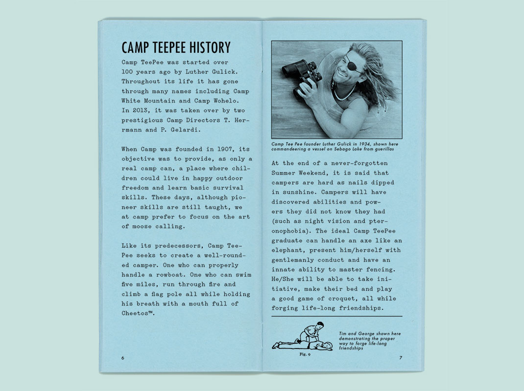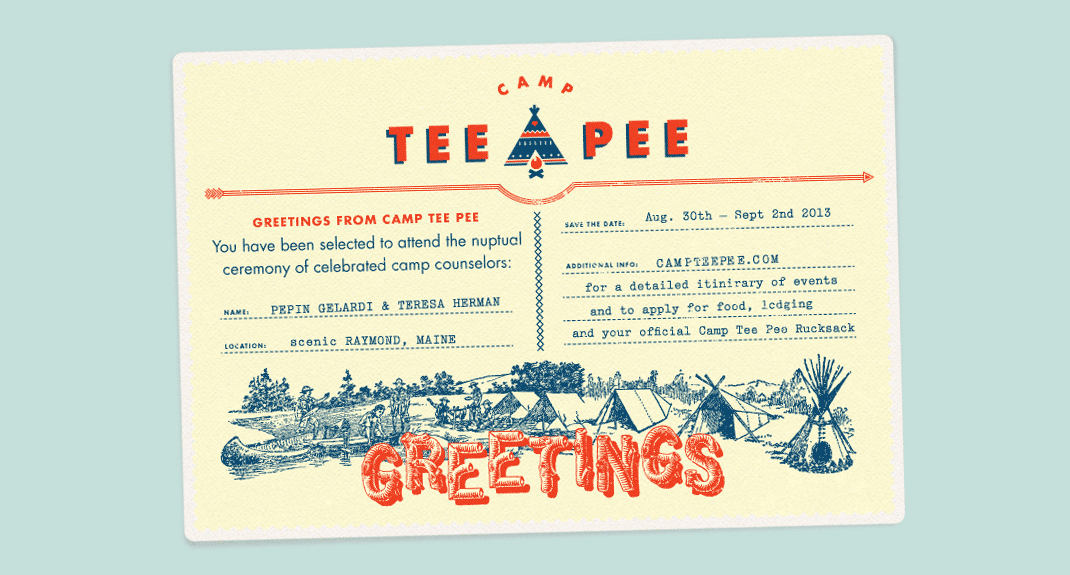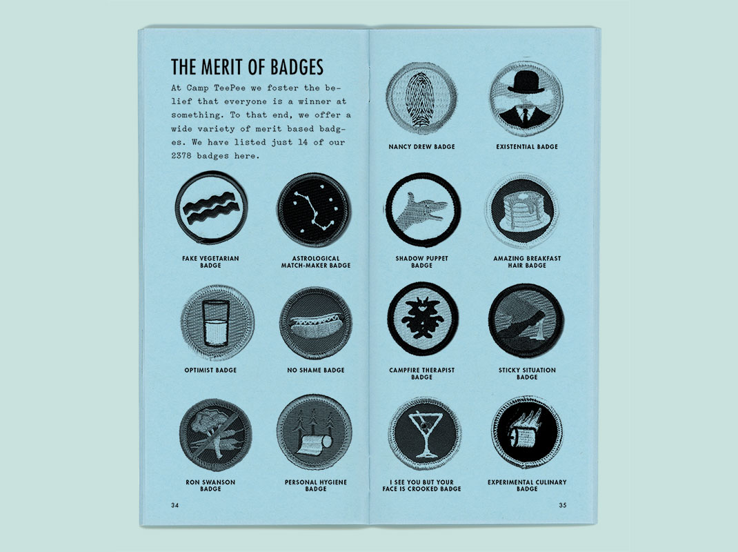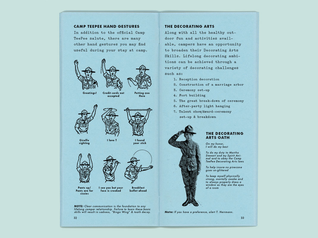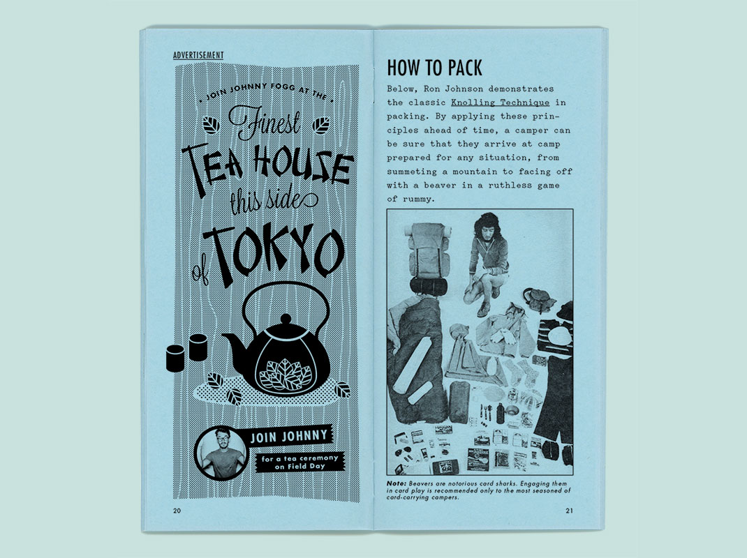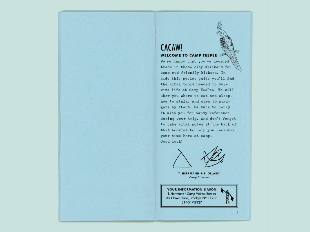 For the wedding of our friends Teresa & Pepin, we worked together to create the identity and collateral for their camp themed wedding. The system including a letterpressed info wheel, stationery set and a 50 page camp guidebook. We worked closely with the couple to craft both the content and the writing, merging the pragmatics of camp advice and boyscout vigor with absurdist humor. Somehow, a giraffe got involved.
