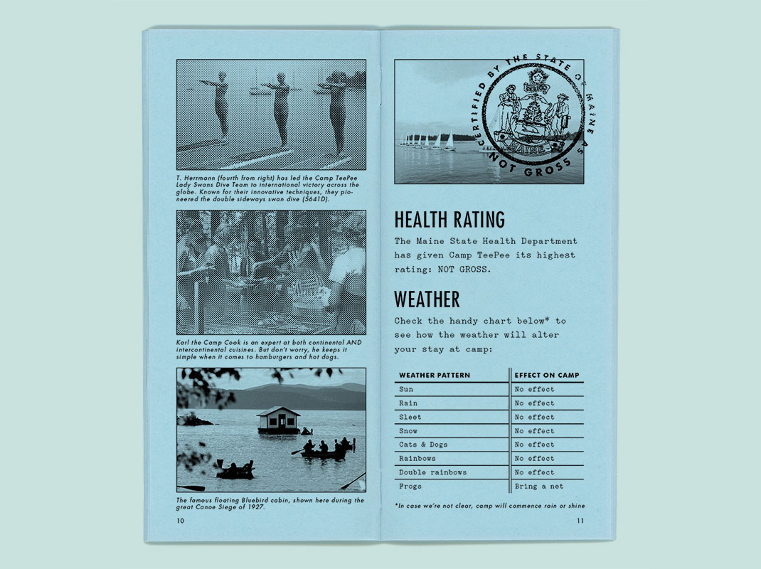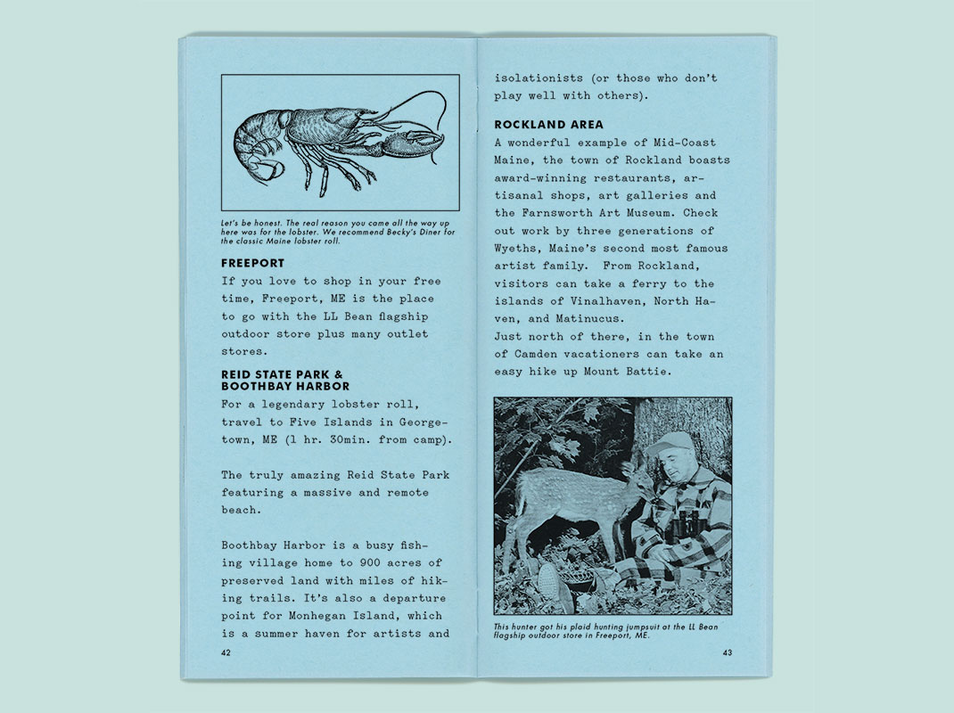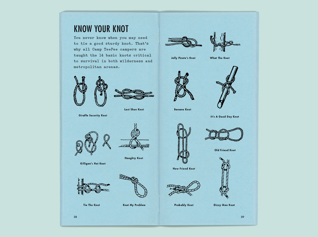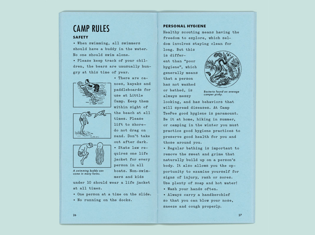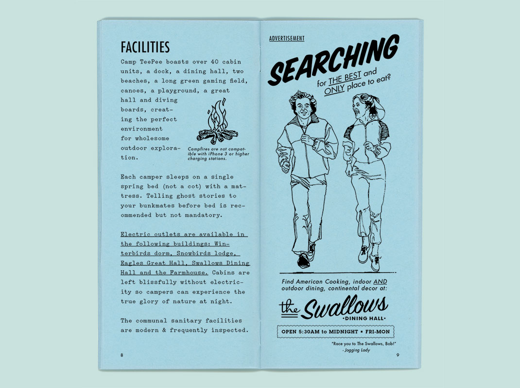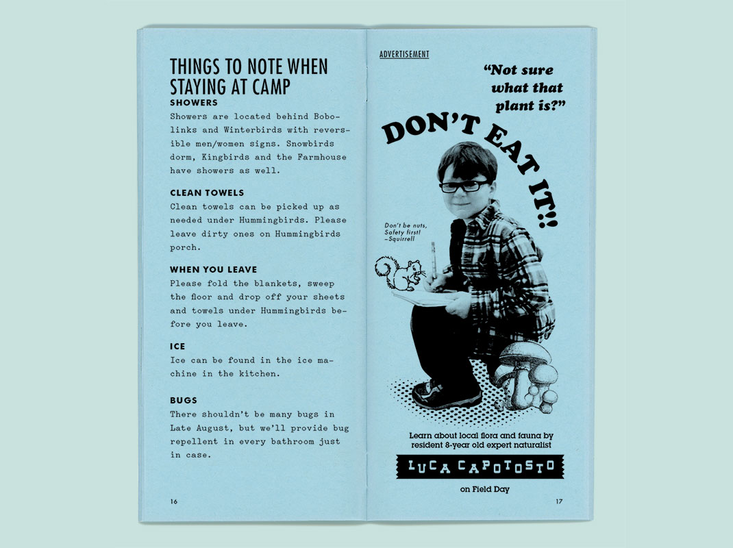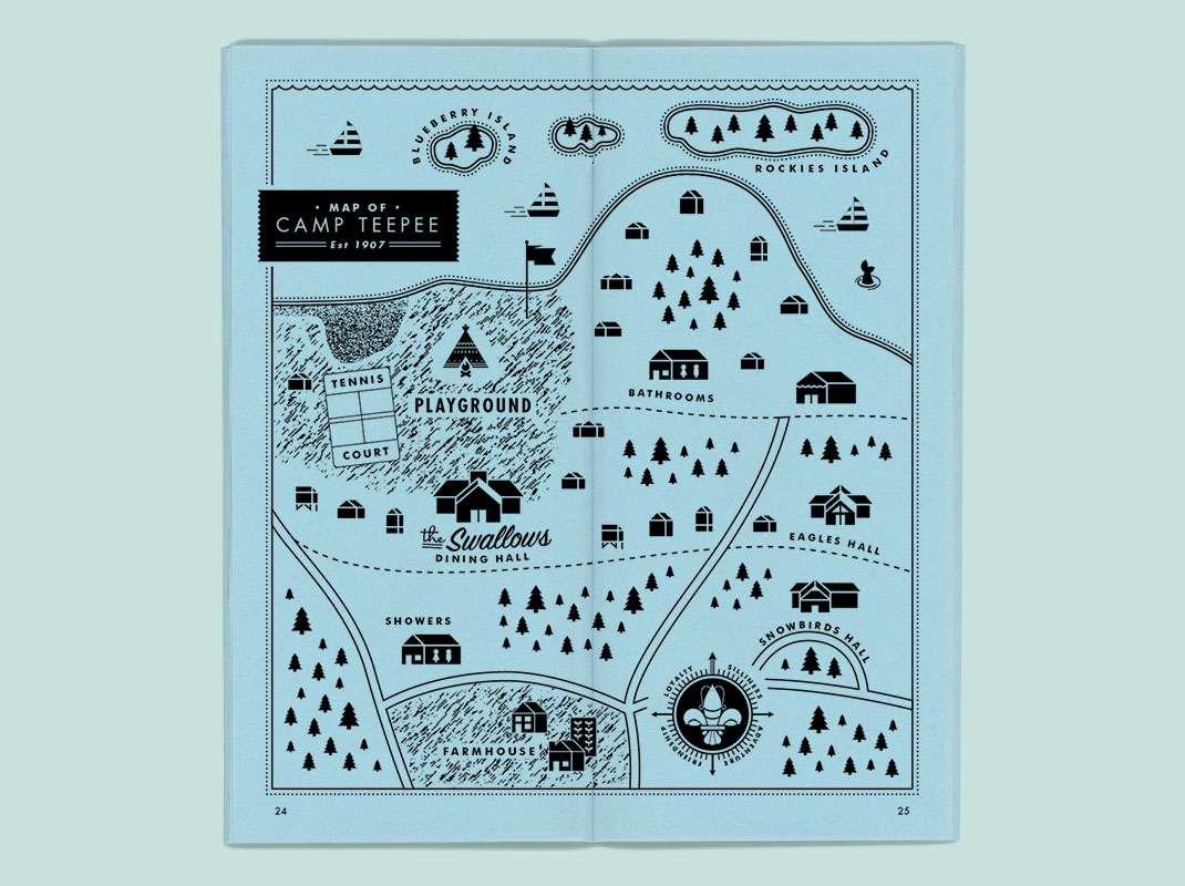 For the wedding of our friends Teresa & Pepin, we worked together to create the identity and collateral for their camp themed wedding. The system including a letterpressed info wheel, stationery set and a 50 page camp guidebook. We worked closely with the couple to craft both the content and the writing, merging the pragmatics of camp advice and boyscout vigor with absurdist humor. Somehow, a giraffe got involved.