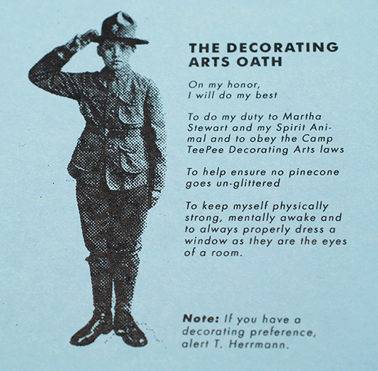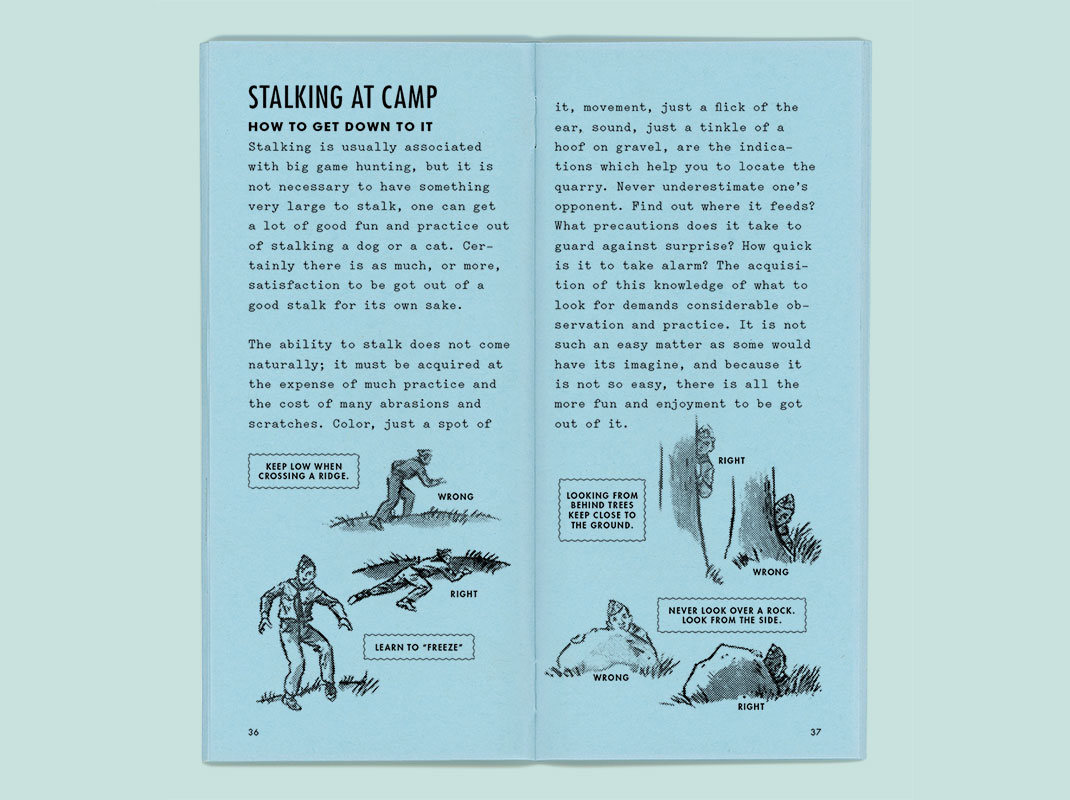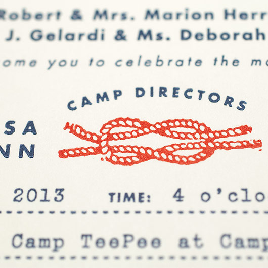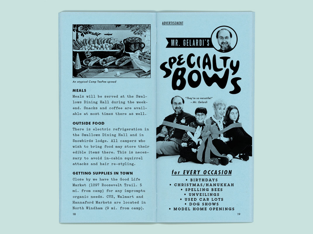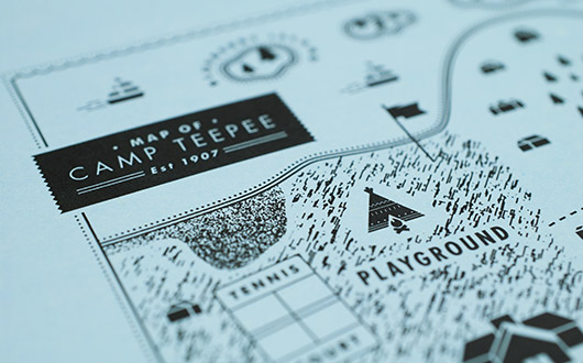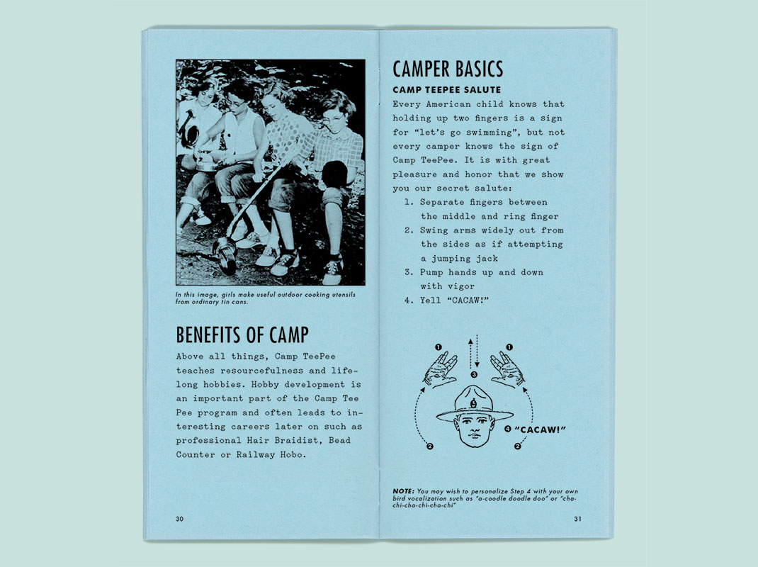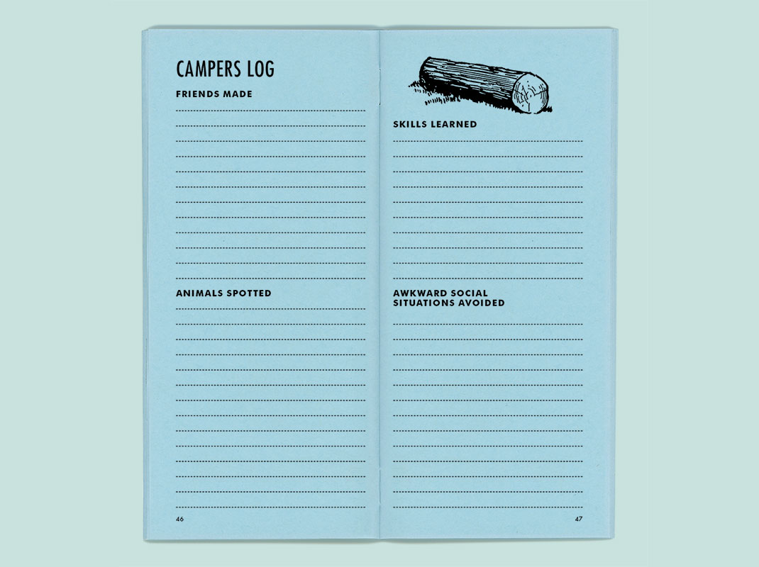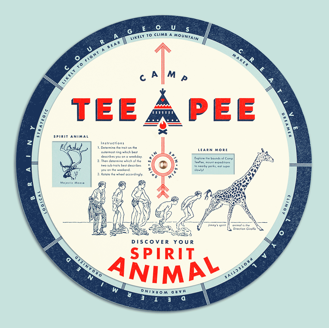 For the wedding of our friends Teresa & Pepin, we worked together to create the identity and collateral for their camp themed wedding. The system including a letterpressed info wheel, stationery set and a 50 page camp guidebook. We worked closely with the couple to craft both the content and the writing, merging the pragmatics of camp advice and boyscout vigor with absurdist humor. Somehow, a giraffe got involved.